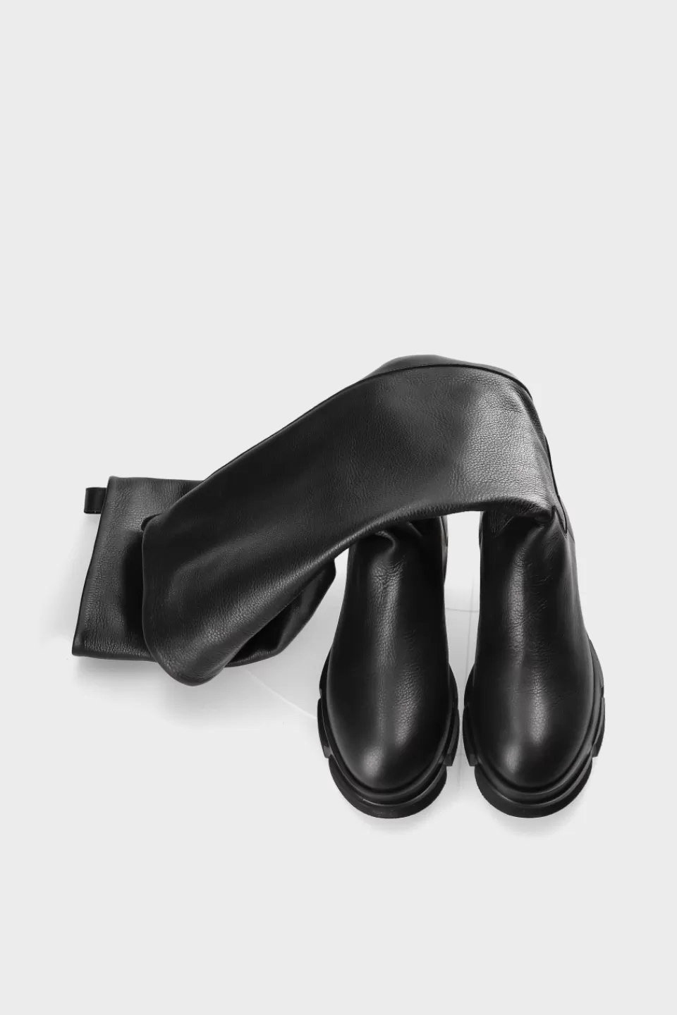 In Schwarz. Kniehohe Stiefel aus weichem Glattleder. Schlanke Silhouette. Schmaler Schaft mit gestickten Details. Goldfarbenes Logo an der Außenseite. Zugschlaufe hinten. Runde Kappe. Klobige Sohle mit markantem Profil und Blockabsatz. Ein ausdrucksstarker Look mit einem minimalistischen Design.